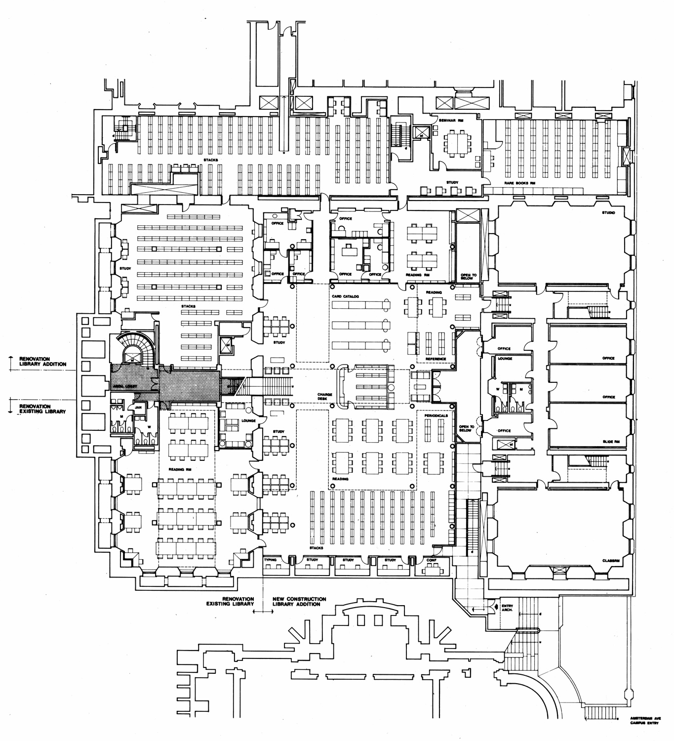 The library space includes a 12,400 sq ft reading room, reference center, book stacks, offices, and a rare book room. The two-story addition is underground to preserve the limited open space in this part of the Columbia University campus.