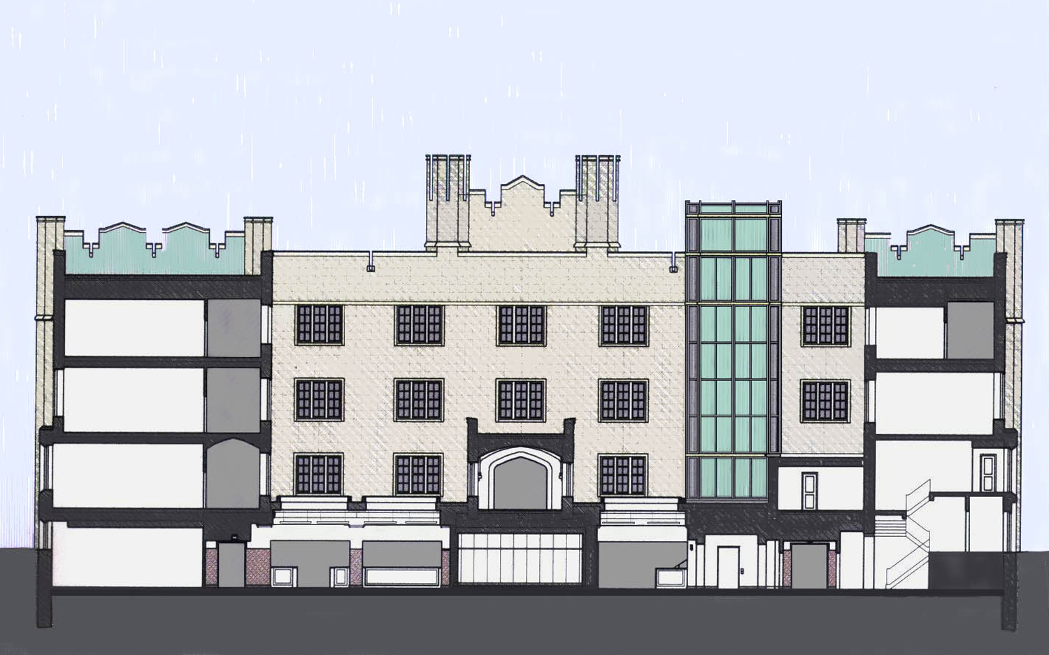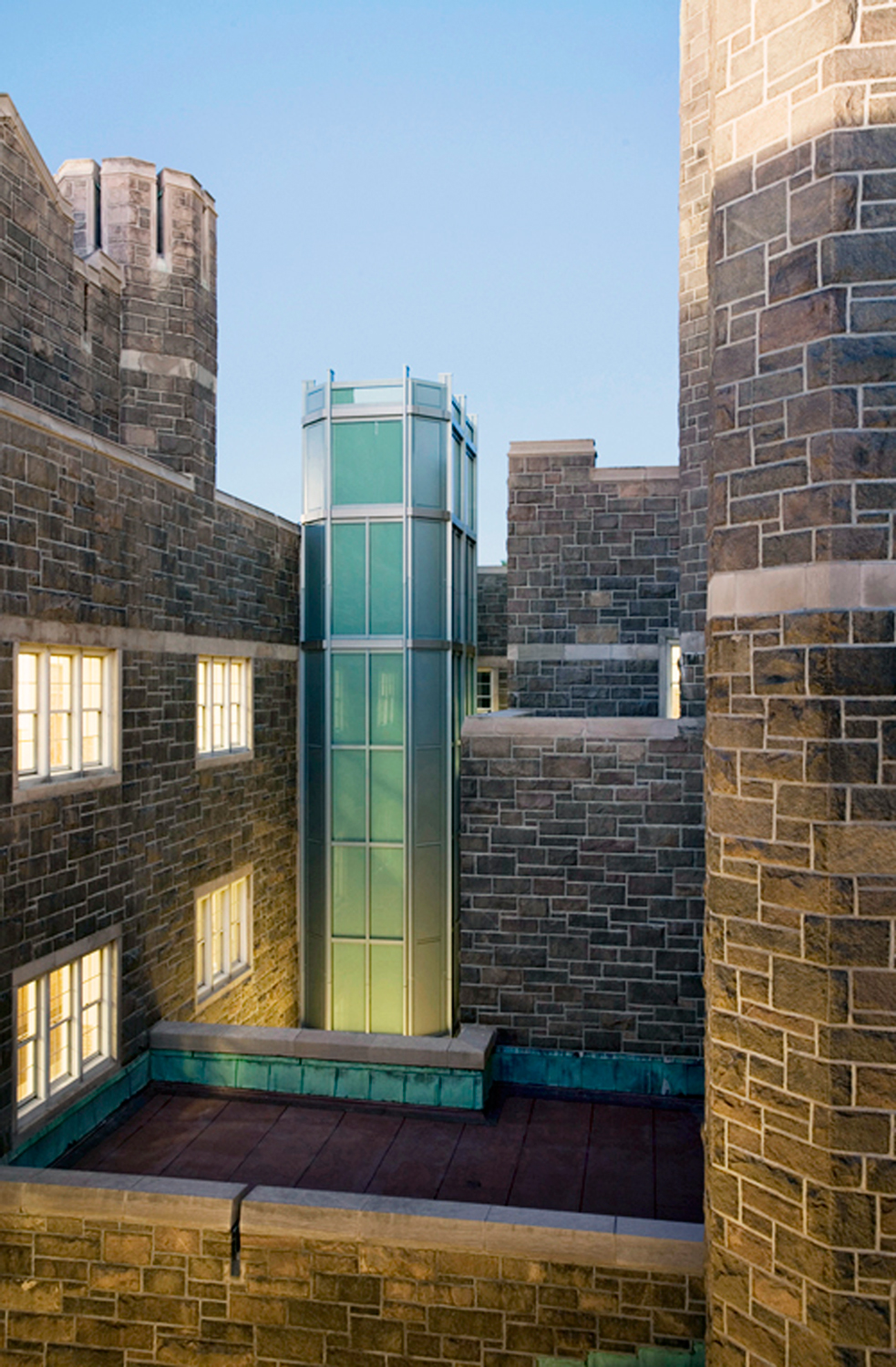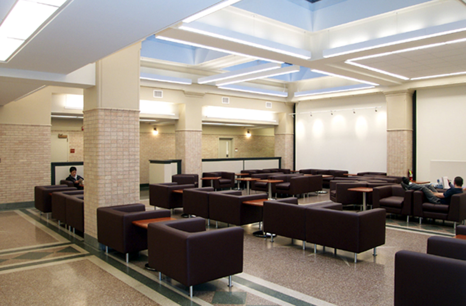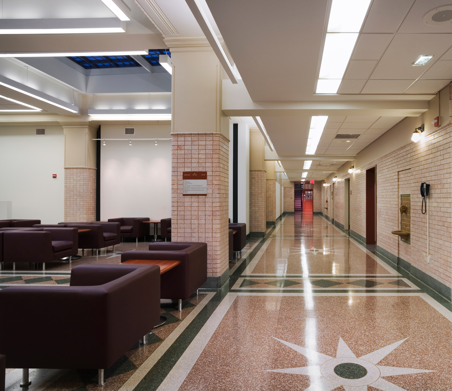 The project’s three main goals were to renovate the existing spaces for new academic programs, to provide a new entrance with an elevator to make the building accessible; and to replace the existing roof, skylights, and mechanical systems. The original campus cafeteria was transformed into the home of the renowned campus public radio station, WFUV.