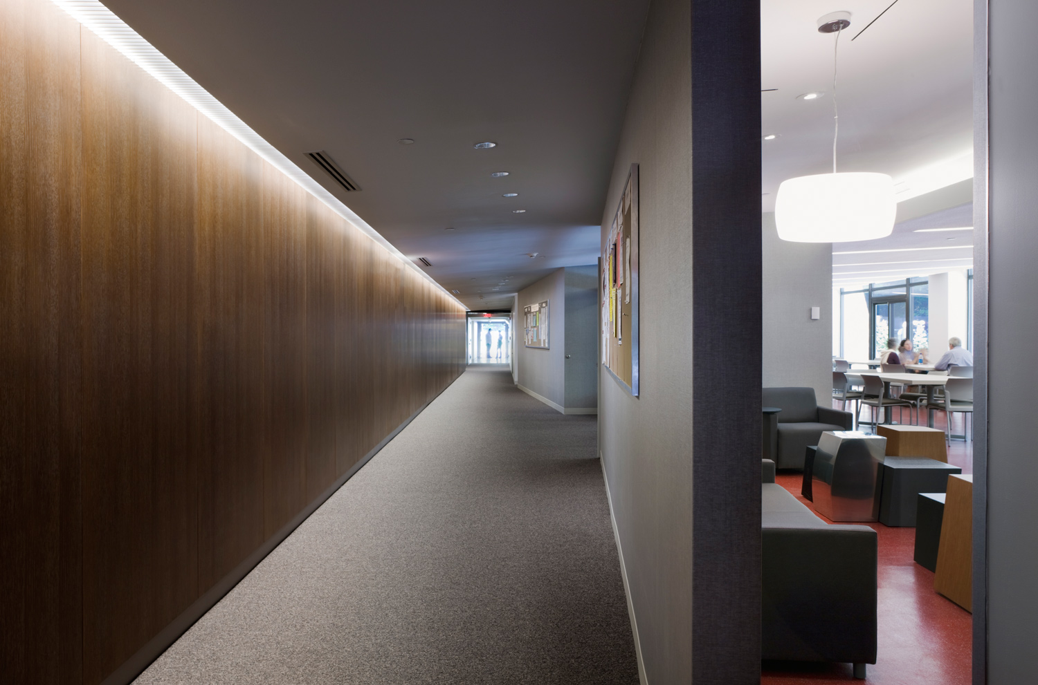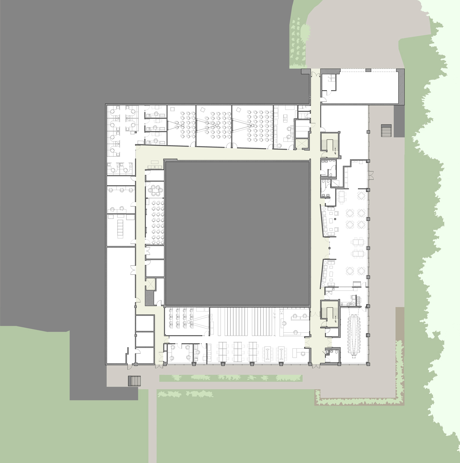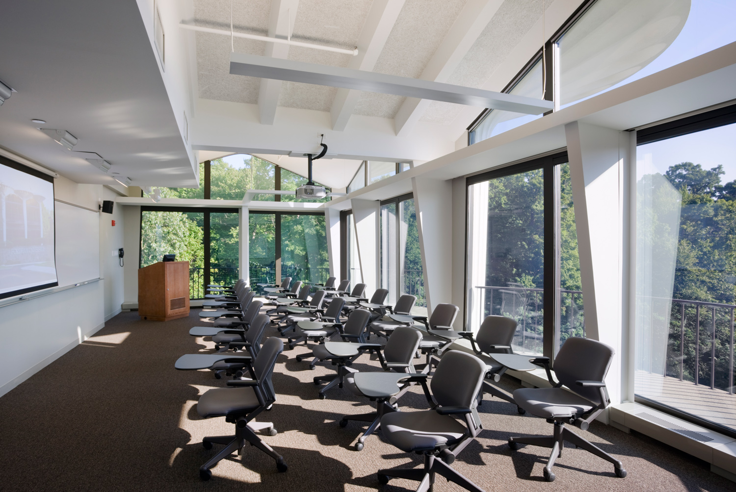 During the design process, our team met with user groups from the university to establish the program. The result was to place the new learning spaces along the perimeter facing the wooded surroundings and to have the primary circulation border the central courtyard. By utilizing the transparency of the curtain wall, exterior elements of the unique 1960s facade are enhanced by the new interior design, further connecting the interior and exterior. Creating a learning monastery for the students and university.