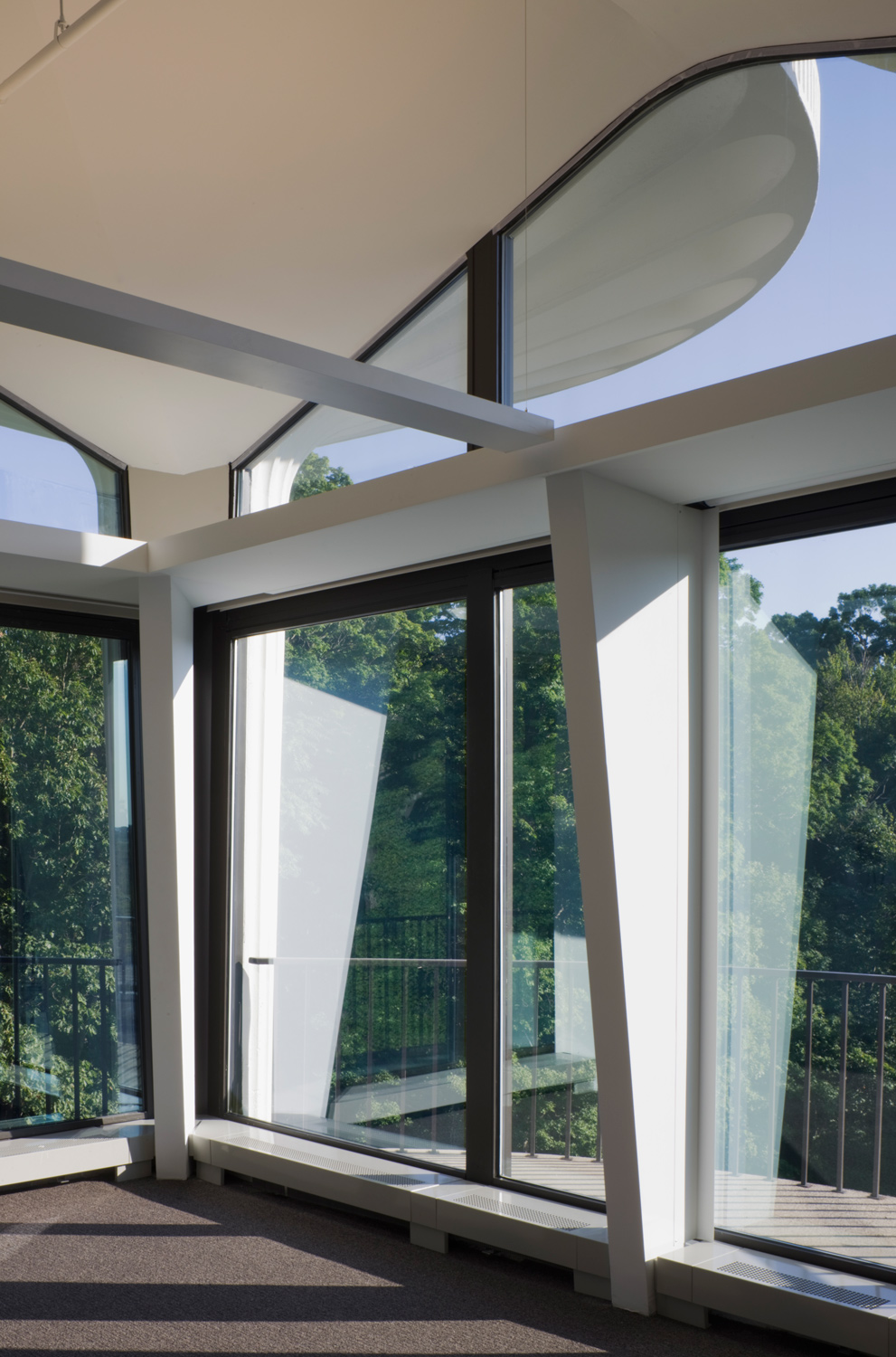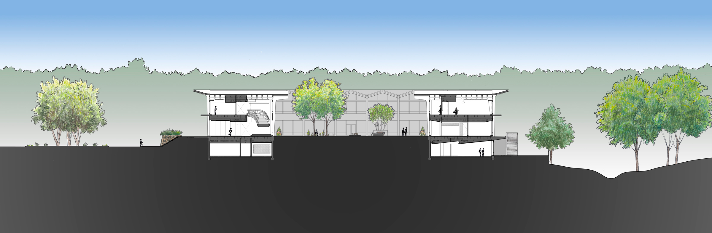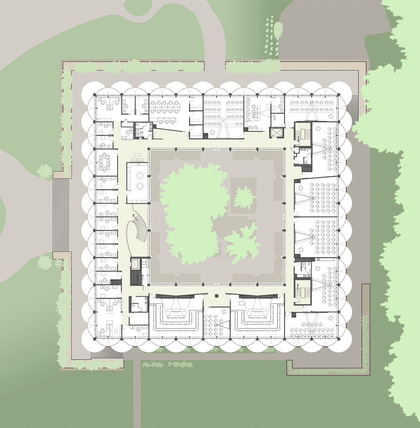 During the design process, our team met with user groups from the university to establish the program. The result was to place the new learning spaces along the perimeter facing the wooded surroundings and to have the primary circulation border the central courtyard. By utilizing the transparency of the curtain wall, exterior elements of the unique 1960s facade are enhanced by the new interior design, further connecting the interior and exterior. Creating a learning monastery for the students and university.