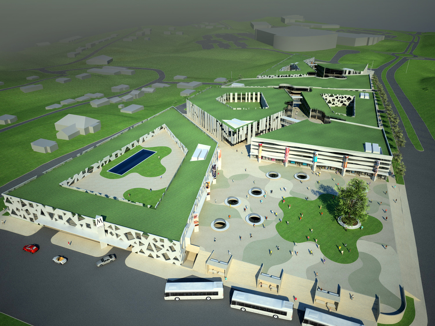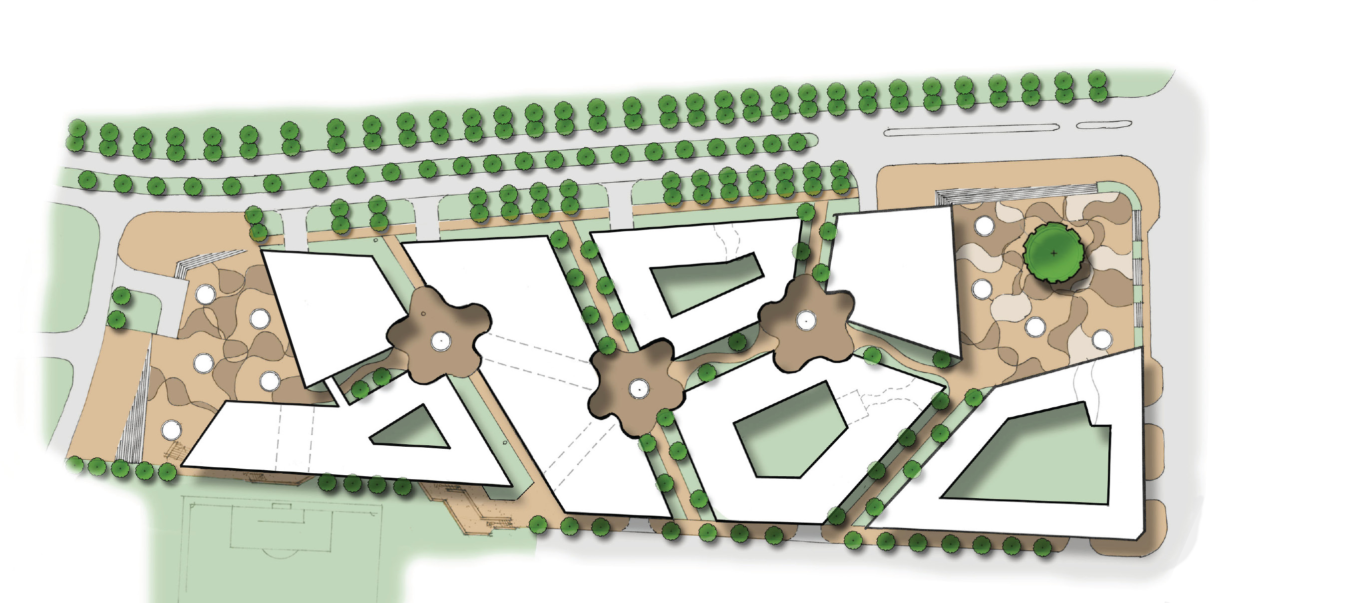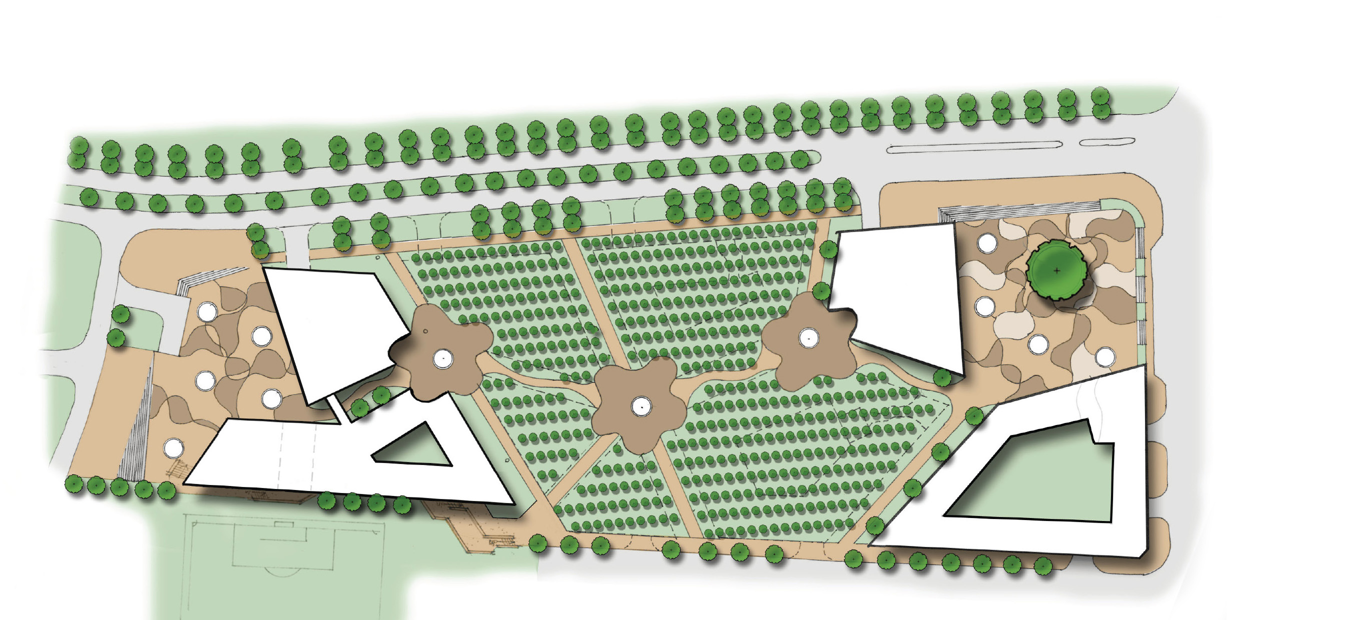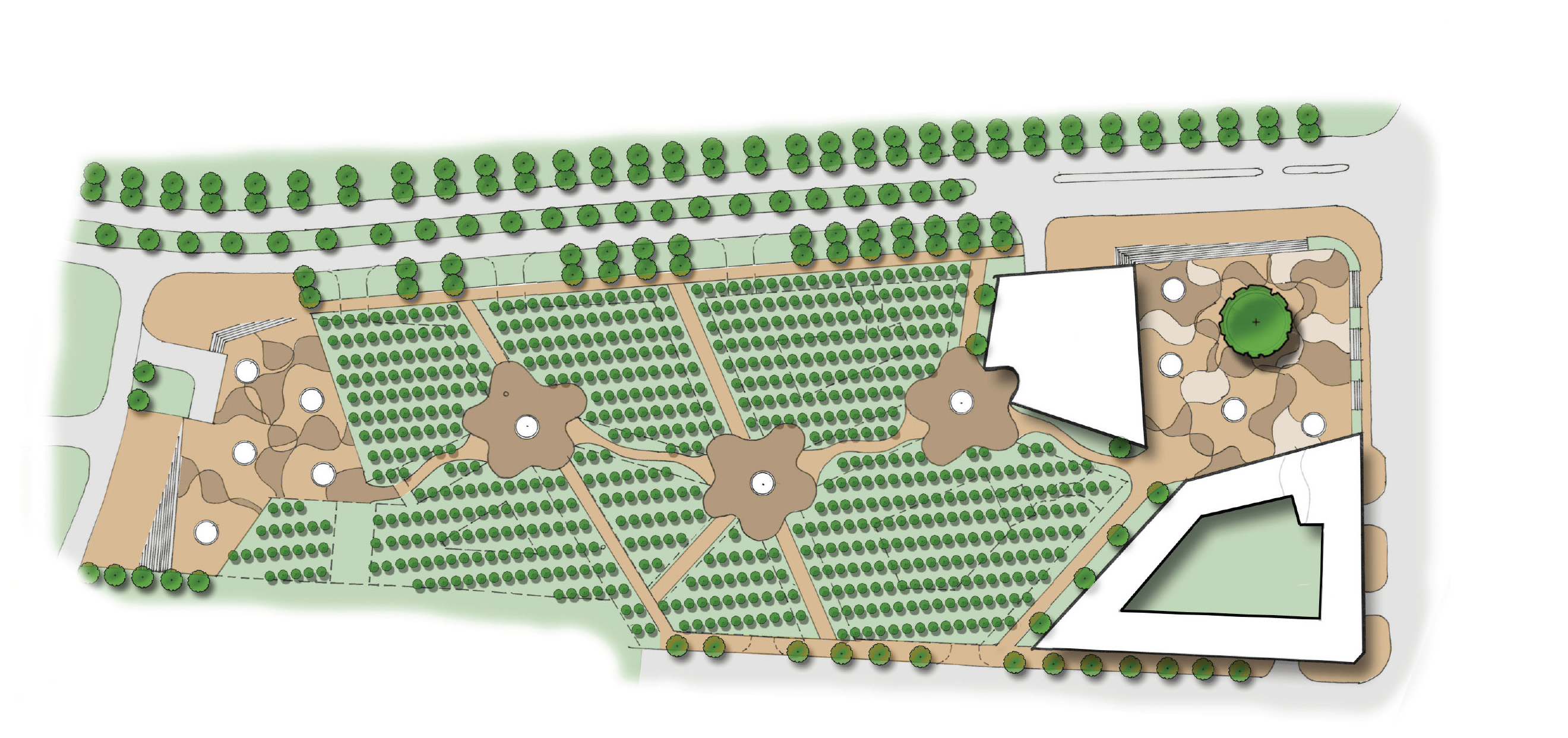 The project is built out in 3 phases. Phase 1 consists of a 78-room hotel with meeting facilities, a restaurant, approximately 24,000 sq ft of retail space, and 34,000 sq ft of office space on a plaza that faces the city. A tree farm populates the unbuilt portions of the site during the initial phases.