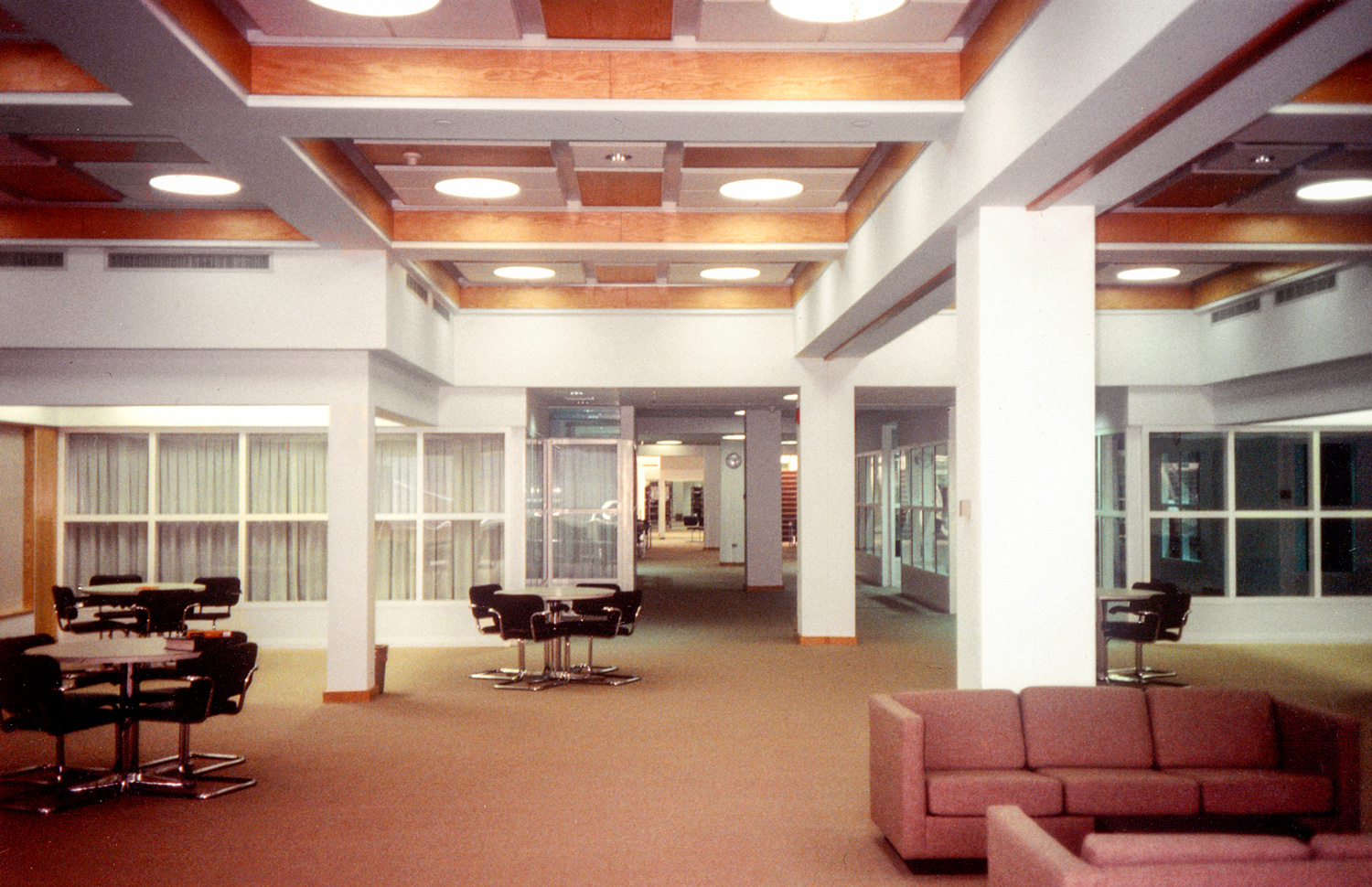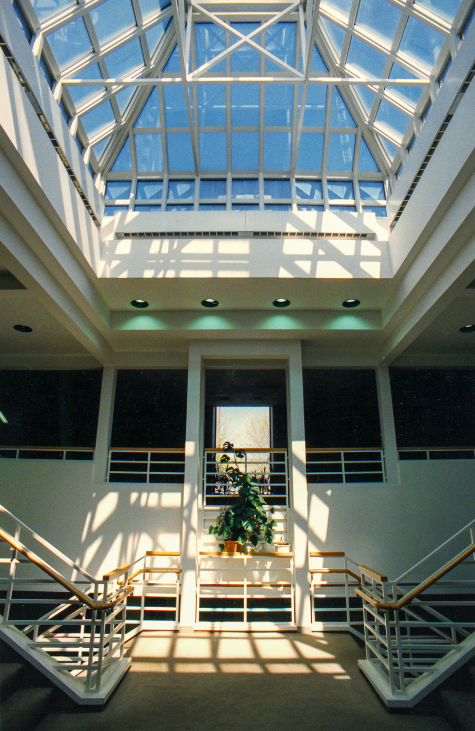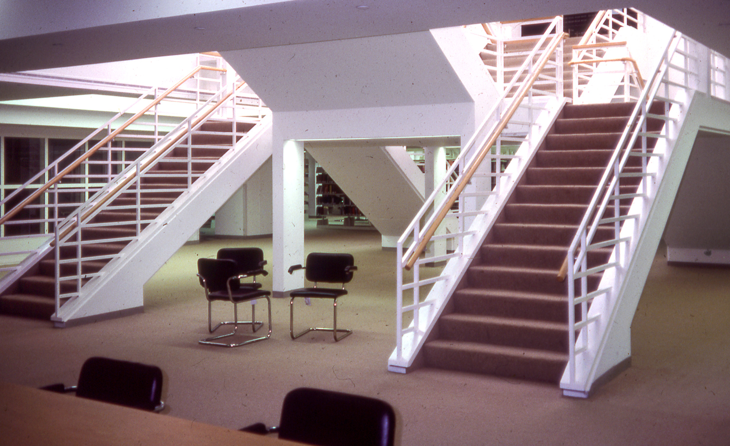 The extension of the library for the State University College at Purchase capitalized on a previously underground and unused shelled space. The new 58,000 sq ft expansion is organized around a cubic atrium and monumental stair connecting to the original library's first floor. As one descends down the central staircase, one discovers an expansive space flooded with natural light from the skylights above.