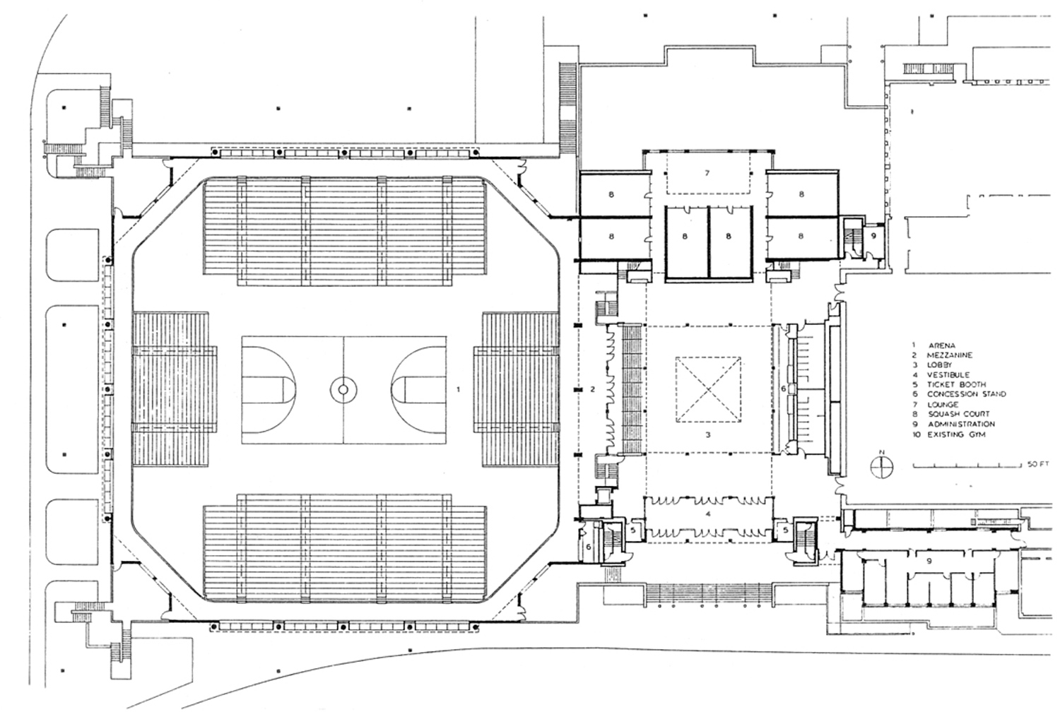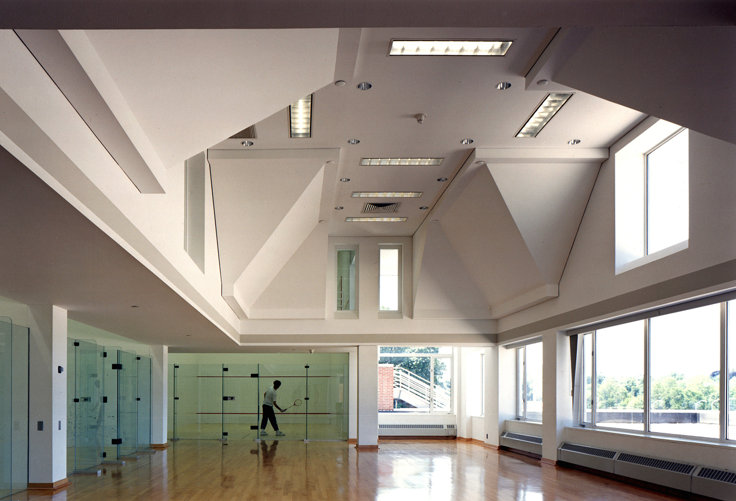 The Sports Complex at Stony Brook University is an addition to an existing 30-year-old facility. The addition contains a field house, six squash courts, a lounge overlooking the sports fields, therapy and team facilities, a laundry room and equipment distribution, and a lobby connecting the new and existing facilities.