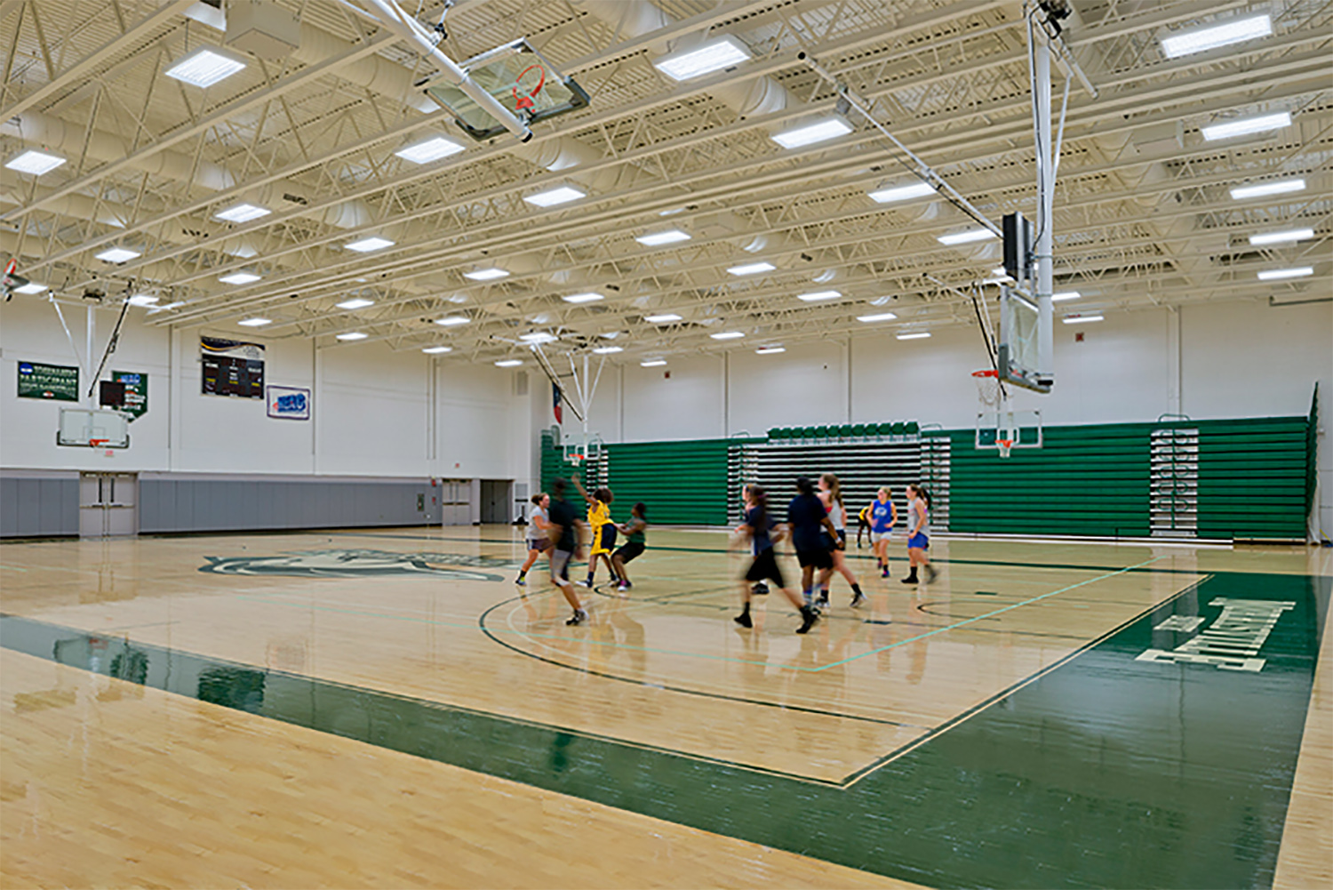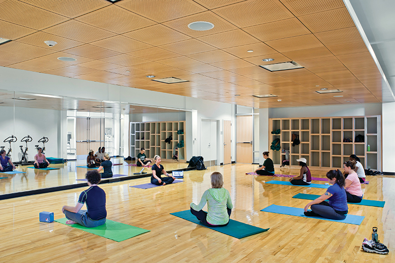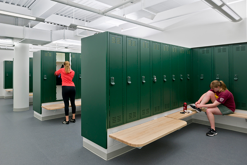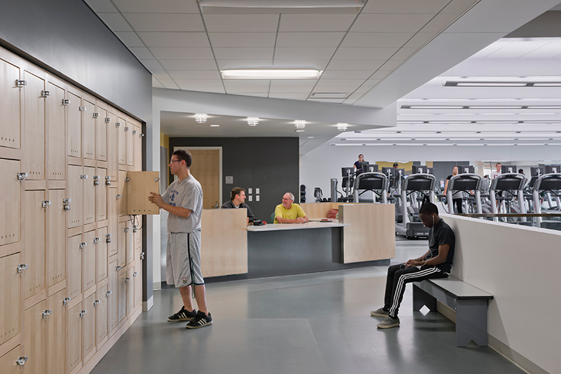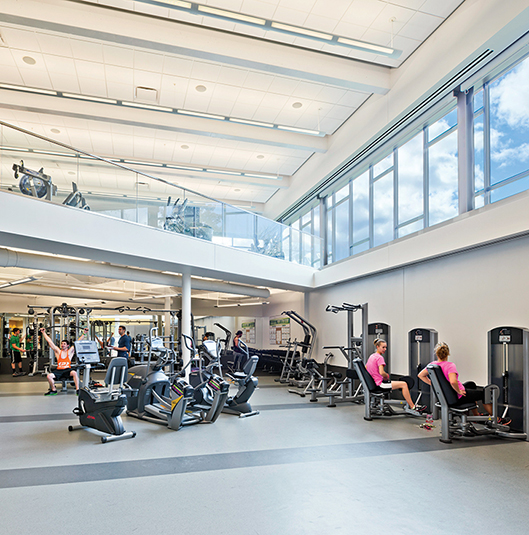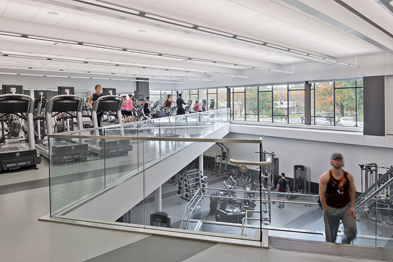 In this renovation, completed in partnership with Sasaki Associates, the main stairway was opened up to create a central lobby that connected all sections of the building around one nucleus. With the use of a large skylight directly overhead, natural light now filled the building. Additionally, a strategic decision was made to convert the defunct swimming pool into a new weight and fitness area. The new balcony on the second level doubles floor space and flexible programming to meet the ever-changing needs of users.