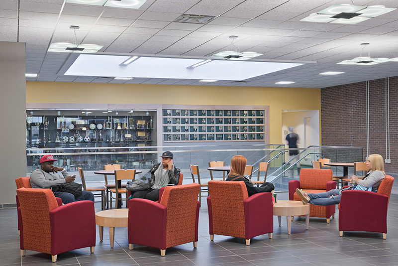 The student recreation building at SUNY Morrisville was originally an outdated and overcrowded cluster of a dining hall, performance center, student club offices, and a student life hub. Separated only by a tight central stairway within that caused inefficient circulation and programming for the students as the school continued to grow.