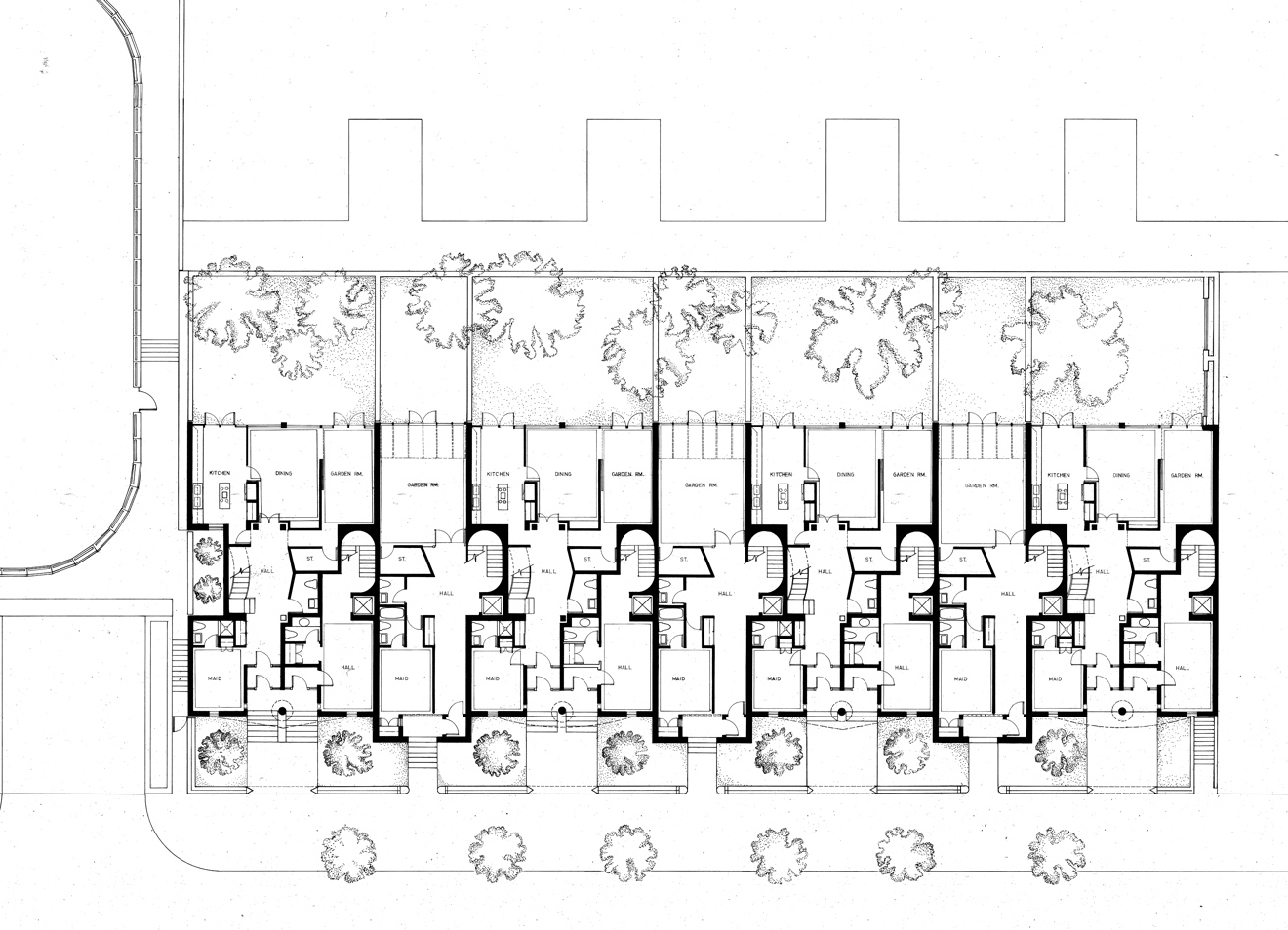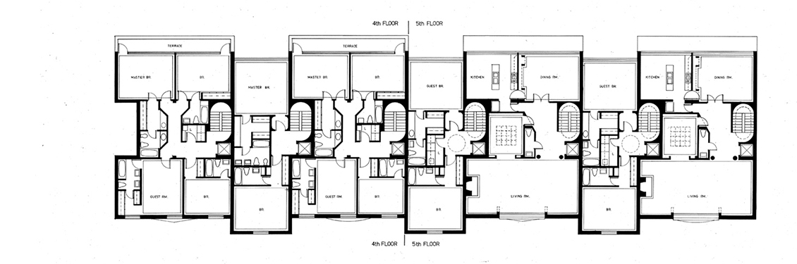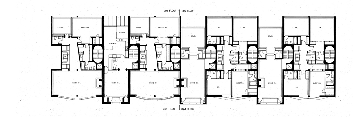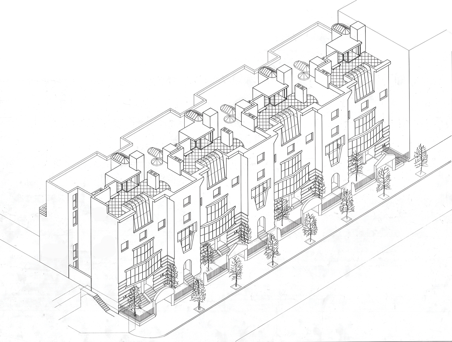 This project is a limited design competition to design 11 luxury townhouses over an existing two-story underground garage that serves a 40-story residential tower. The bow windows, the artist studio windows, and keystone balconies not only relate to elements on other Upper East Side townhouses but also help to give character and identity to the units.
