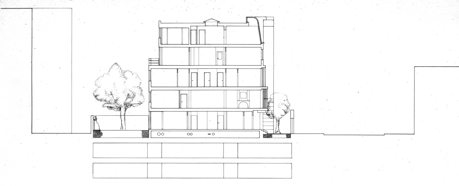 The maisonette on the 4th and 5th floors of the wide unit is accessed from the ground level entry via an elevator. The lower wide and thin units have gardens on top of the garage. The maisonette has its “garden” on the roof.